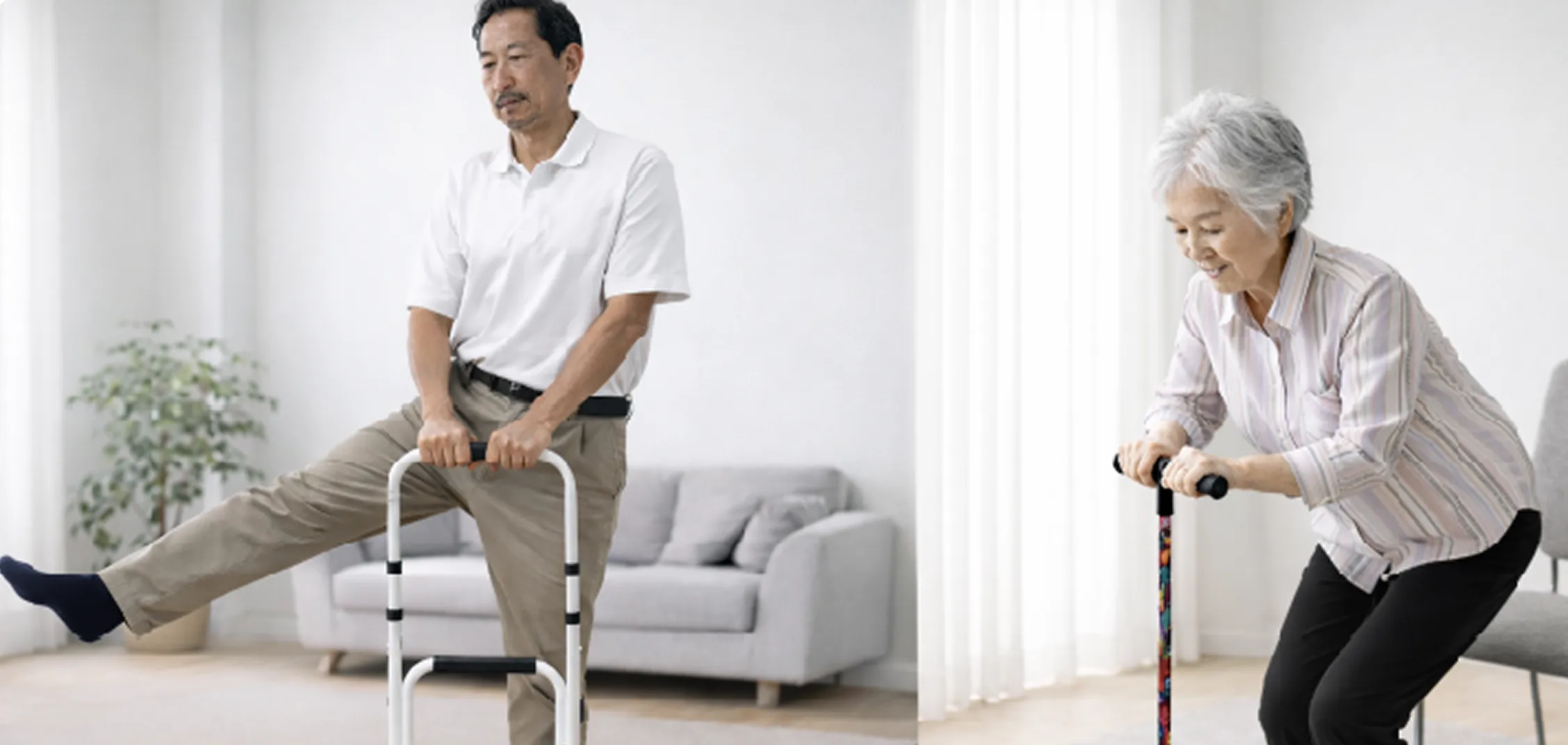 室内でも屋外でも転倒の危険が十分あります。常に補助具を使用して歩く事をお薦めします。