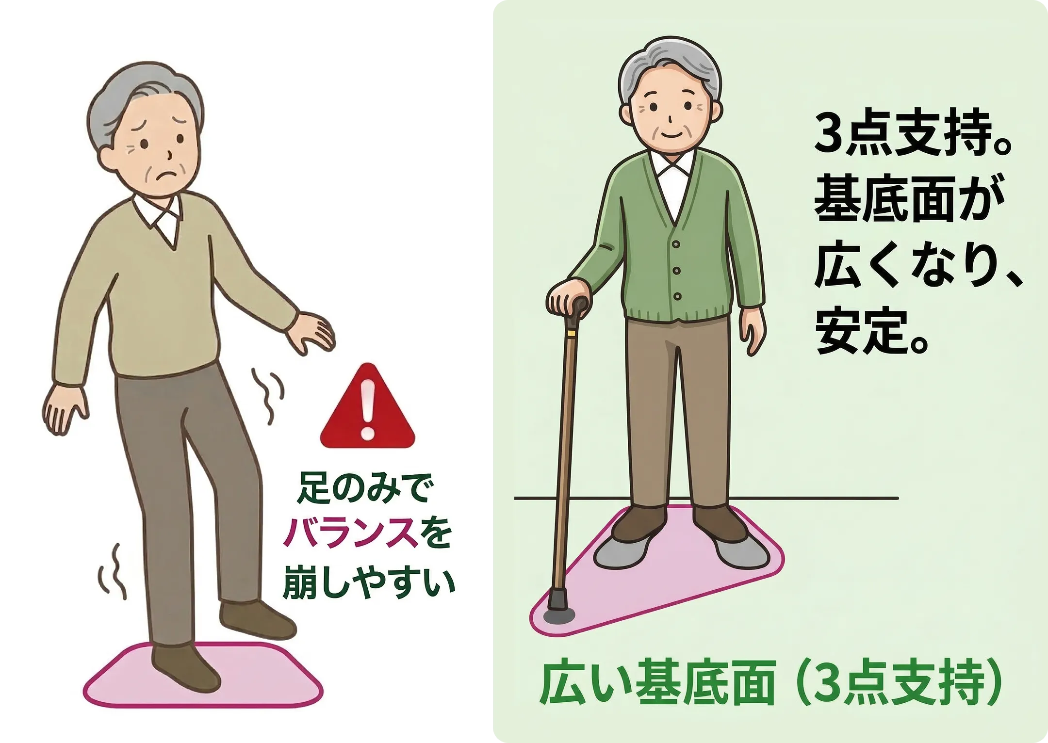 歩く事は「片足立ちが約80%」ですのでステッキで基底面を広くする事で転倒防止に役立ちます。